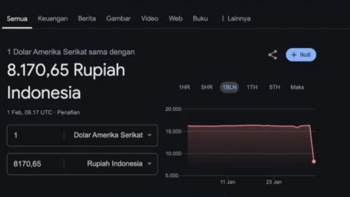 Menurut pantauan NTVnews, hasil tersebut berdasarkan penelusuran saat melakukan pengecekkan konversi nilai tukar dollar ke rupiah dengan menggunakan kata kunci “USD to IDR” pada pukul 17.47 WIB pada Sabtu 1 Februari 2025.